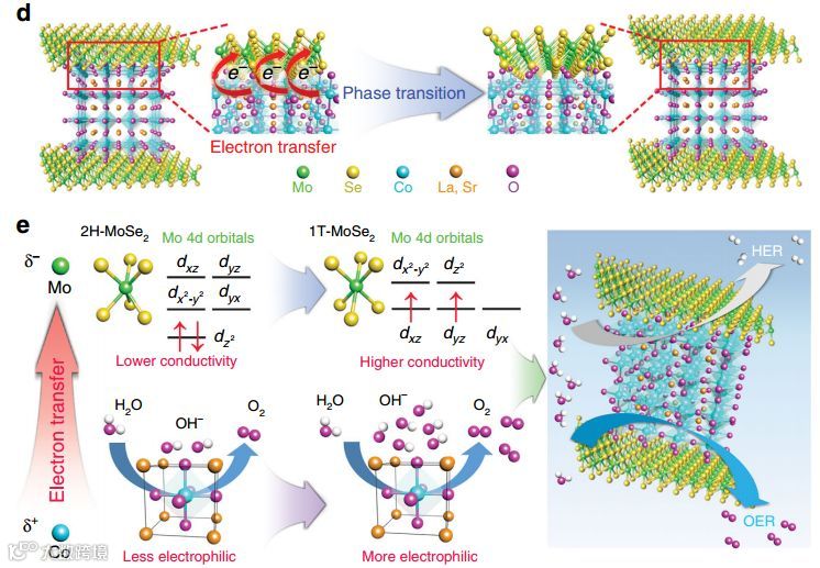 韩国蔚山国家科学技术研究所(UNIST)Hyesung Park、SangKyu Kwak与 Guntae Kim团队设计了一种复合钙钛矿氧化物-TMD异质结构,由MoSe2、La0.5Sr0.5CoO3-δ(LSC)和科琴黑(KB)组成,用于整体水电解的双功能电催化剂。在LSC和MoSe2异质结构的形成过程中观察到MoSe2(从2H-到1T-MoSe2)的原位局部相变,和更亲电的LSC,这是由于从Co到Mo发生的自发电子转移,使得Co离子得到部分氧化。这种电荷转移有望增强MoSe2固有电导率和增加LSC中Co-O和Co-OH的量,可以增强水分解催化活性。这些协同效应一起作用,使氢和氧析出反应的电化学活性显著提高。该异质结构在高电流密度100mA cm-2下1000 h内表现出优异的总水电解稳定性。