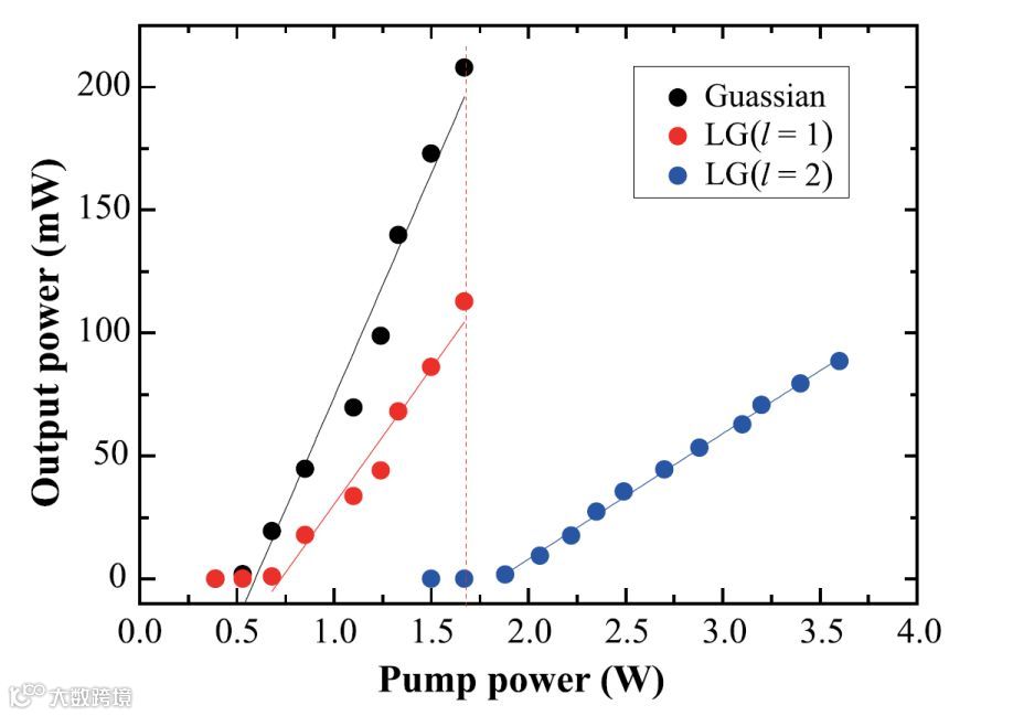 光束的泵浦输出功率曲线如图3中红色线条所示,阈值功率约0.7W,斜效率为11.06%。阈值功率的增加和斜效率的减小是由于VWP的插入,引入了额外的损耗。用拓扑荷为m = 2的VWP输出