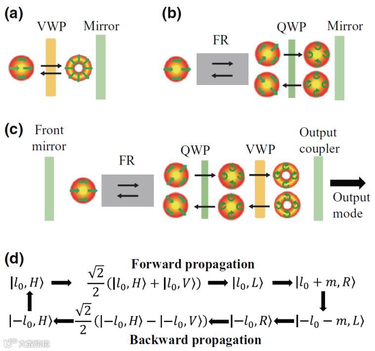 图1:VWP中每一处液晶光轴取向随其所在的方位角变化,当圆偏振高斯光束入射时,便可以得到与输入偏振手性相反的圆偏振OAM光束输出,即自旋-轨道角动量转换。在腔内,为实现自旋-轨道角动量转换,需要在VWP前放置四分之一波片将线偏振转换为圆偏振。当输入光束偏振方向与四分之一波片平行时,法拉第旋光器和四分之一波片的组合能够实现光束的可逆传输(图1c)。因此,结合法拉第旋光器、四分之一波片以及VWP,研究人员实现了光束在腔内的可逆转换,并且可以通过选择VWP和旋转四分之一波片改变输出的LG模式所携带的拓扑荷。图1d呈现了谐振腔中光场的偏振和拓扑荷在一个往返过程中的可逆转换。