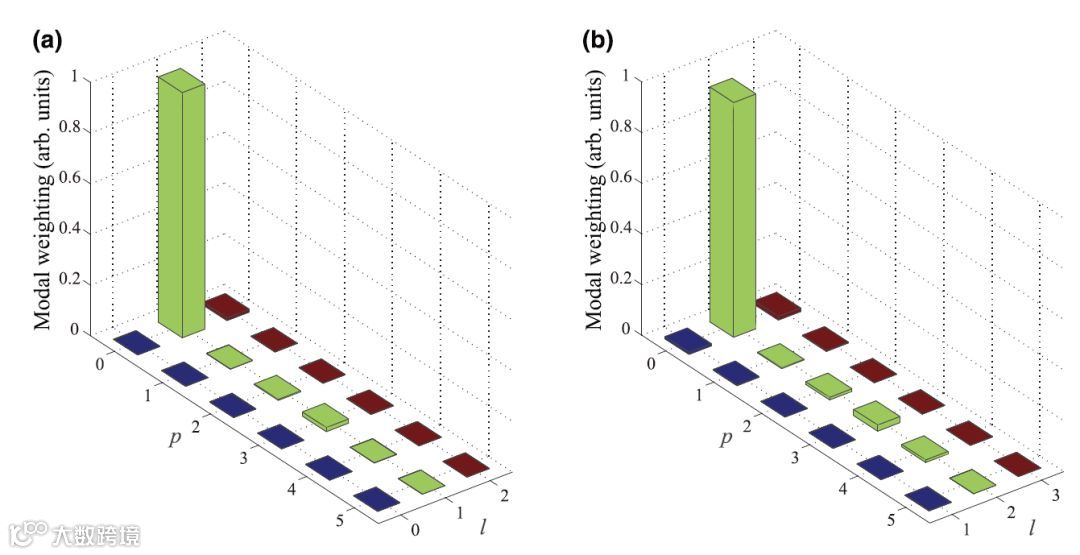 =0-3的标准LG模式,对输出的LG模式进行分解,得到各模式成份的权重。分析结果显示谐振腔输出