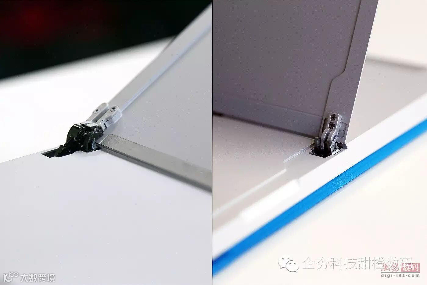 此外就是转轴。前文也说了,Surface Pro 3采用的是一体化一体式支架,开合角度大不说而且用户可随自己的意愿在角度范围内随意调整适合自己的角度。而Surface 3采用的是类似齿轮的转轴,整个转轴只有3档可选,这也是二者的明显区别之一。