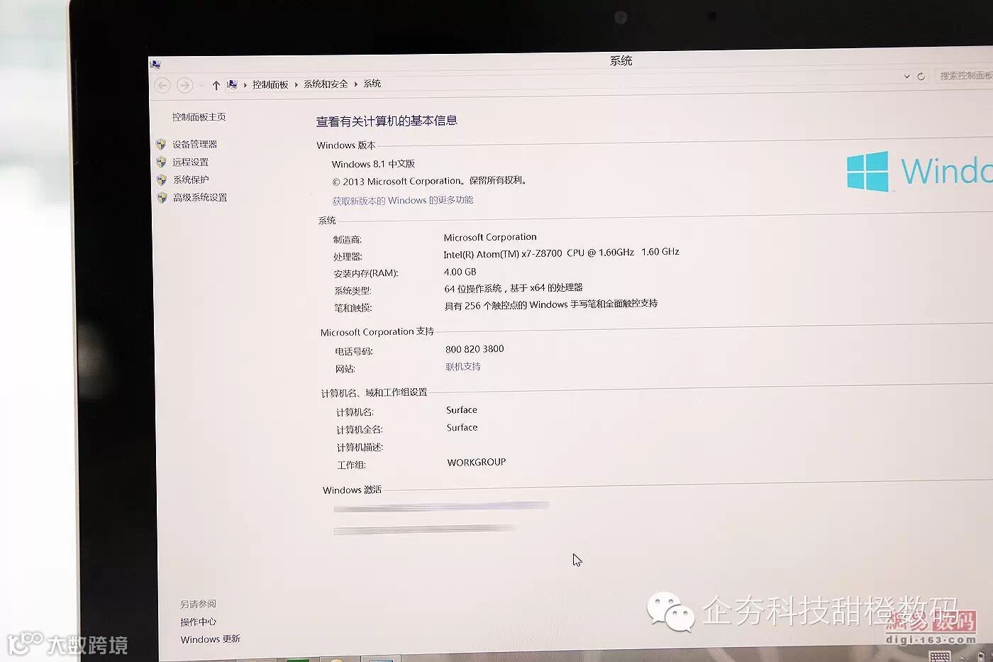 第一次开机后,我们便看到了Surface的字样。前文说过,Surface 3搭载的是Win8.1的系统,所以开机后均是激活Windows的界面在此就不细细表述了。