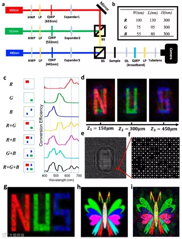 (g) 彩色同面超表面全息成像测试结果 (“NUS”) 。
