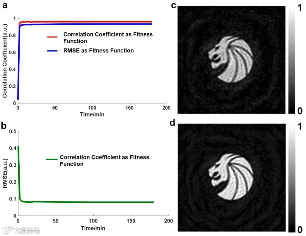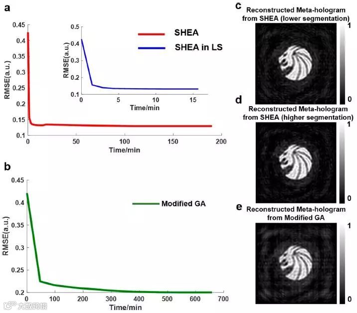 研究人员提出并实现了一种分段的分层进化算法,旨在解决大尺度、复杂度较高的光学器件设计问题。在这种分层进化算法下,搜索参数空间具有更快速的收敛速度。作为演示范例,研究人员选择了大尺寸的超表面全息结构来证明这种算法的有效性。在这种算法中,研究人员利用改进的适应度函数取代了以往算法中常用的均方根误差函数,这能够加强图像像素之间的性能平衡,从而提高图像质量,进一步加快计算速度。通过此算法与点源模型相结合,研究人员设计并制备了具有高保真度的超表面光学全息器件(图一)。与传统的改进型遗传算法相比,该分层进化算法在运算时间以及收敛速度等方面更具优势(图二)。这种分段的分层进化算法和改进的适应度函数不仅可以应用于全息图设计,还可以与各种复杂的近场/远场光学器件的设计或适当的理论模型结合使用,在未来高质量甚至多目标的光学器件的设计中具有潜在的应用价值。