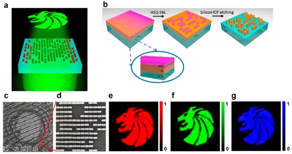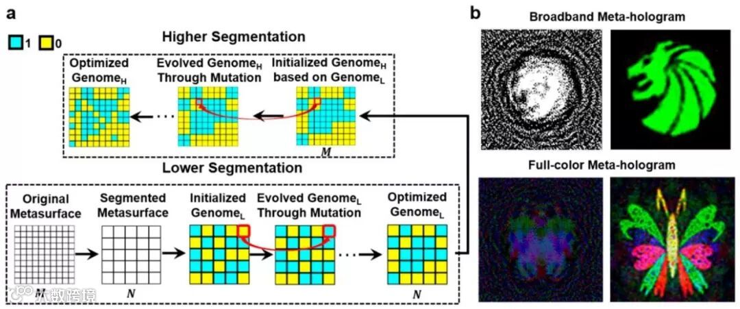 (b) 基于分层进化算法设计的高像素宽带超表面全息以及全彩超表面全息(狮子原图版权来自SevenLions音乐公司,已授权使用)。