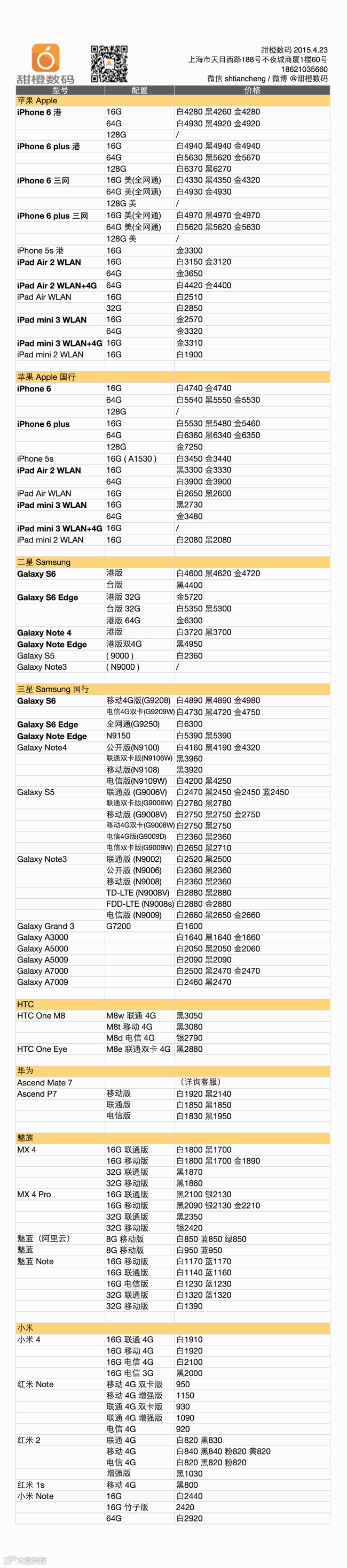 iPhone 6 港版稳定,但 plus 64G 有小幅反弹,之前没有抄底成功的朋友下次要抓紧时机;iPhone 6 及 plus 的国行和美版均稳定;Galaxy S6 及 S6 Edge 目前稳定,S5、Note 4 等次旗舰稍有降价;魅蓝 Note 有跌价;iPad 各款价格有松动。