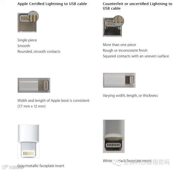 此外苹果还指导顾客如何区分苹果 Lightning 接口和仿制品 Lightning 的区别,我们可以先仔细查看 Lightning 接口那一端,验证的办法包括了查看连接头白色包裹部分的宽度和长度,和 Lightning 插入端的面板(正版的线缆一般是灰色的金属)。