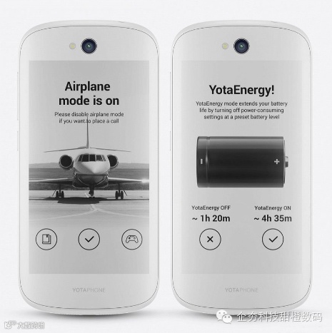 手机上还出现了自动模式,它可以为第二块屏引入一些特殊的应用程序。它有一些有趣的功能,例如:日历上标记的即将到来的会议会在开始之前以倒数计时器的形式显示。此外,如果用户装上电池,那么Yota Energy模式中也会包括自动模式。在这种条件下,手机无论在不在Yota Energy模式下都会显示剩余的电量。当切换到Airplane Mode模式时,智能机还会建议用户阅读电子书或者玩游戏。