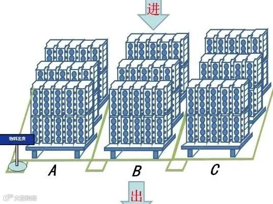 对每一批或每一个货物,填写看板卡,然后按照顺序从后面放置,出库时,根据最前面看板上标识的库位出货。