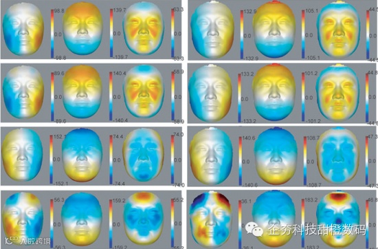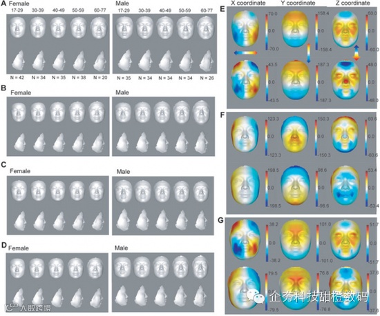 韩博士与同事们对332名17-77岁的志愿者3D面部图像进行了分析,确定了几个随着年龄变化而显著改变的特征,如眼睛的形状,口鼻间的距离,皮肤的光滑度。