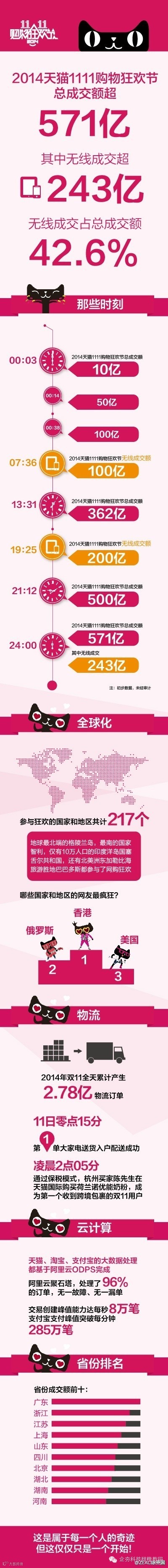 阿里巴巴公布双十一全天交易总额为571亿元,其中无线端贡献了42.6%。而去年,天猫与淘宝的双十一交易总额为350亿元。今年在当天下午13时,销售超突破350亿。数据显示,在活跃交易省份排名中,四川交易额超过北京居全国省份第六位。