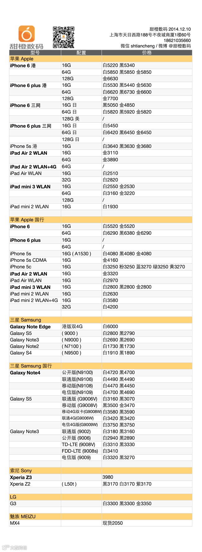 受之前港版 iPhone 6 无法联保的谣言的影响,iPhone 6 及 plus 价格受挫,如今谣言已破,价格却未有反弹,iPhone 6 及 plus 的港版今日有大幅下降,国行版和三网版也随之有小幅降价,详见报价单;Galaxy Note4 和 S5 小幅降价。