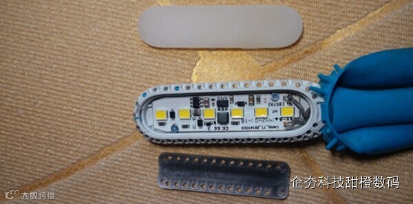 拆下前面的磨砂面罩可以看到内部的LED灯和一些电子原件,采用磨砂面罩的好处是“柔光”避免光的直射。相邻的两个灯发出的光经过折射会让整个LED灯体的光更加一体化,不会有每个灯之间的黑影。经过折射后进入眼睛的光会更柔和,不会那么刺眼。