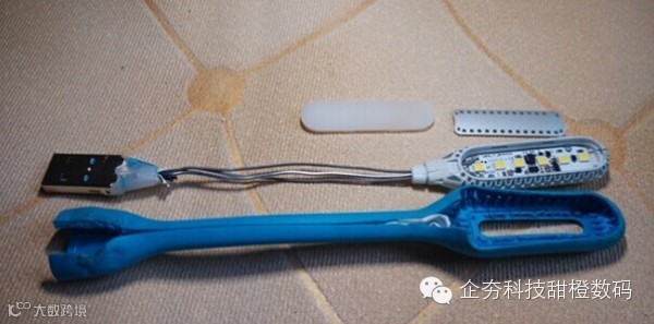 把LED随身灯的衣服扒掉后看到弯折的部分是一根14#的高韧度铁丝。这根铁丝非常柔软也容易定型,不会回弹。两根质量很好的0.5平方毫米的镀锡铜线。这样的导线可以承受3A的电流,所以做1.2W LED灯的电源线是完全足够的,大家可以放心使用。打开后发现小米LED灯不是万向弯折是考虑到机械结构和强度的需要。