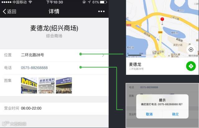 用户点击信息栏后会跳转到门店详情页,页面中的位置信息可跳转到导航功能,电话点击可直接拨打。