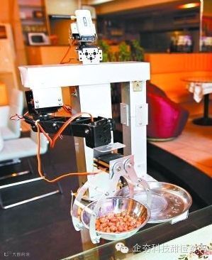 要上菜时,服务员就往它的左手托盘上放菜碟,在后台的电脑控制软件中输入桌号即可。机器人就会从厨房通道口出发,独自慢悠悠地滑到餐桌前,抬起右臂,四个活动关节“嘎吱嘎吱”地响,用充当右手的夹子夹起菜碟,再轻轻放在餐桌上。