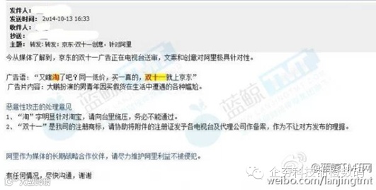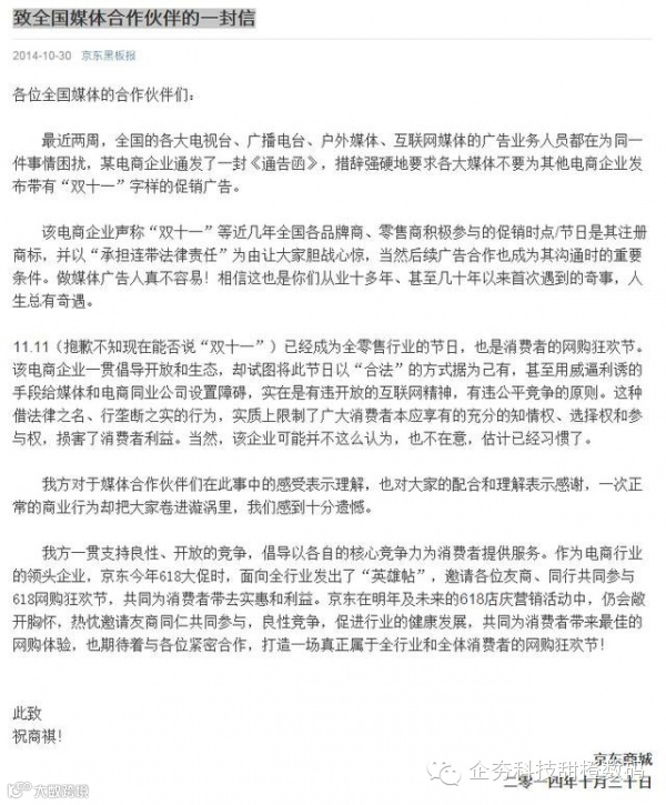 稍后时间,又有消息称阿里准备在双十一“封杀”京东,因为前者注册了“双11”商 标,并且授权天猫独家使用该商标,任何其他公司机构不得使用。现在,京东通过微博对这一事件作出了回应。京东在声明中表示,某电商企业这么做实在是有违开 放的互联网精神,有违公平竞争的原则。实际上是在以法律之名、行垄断之实的行为,实质上限制了广大消费者本应享有的充分的知情权、选择权和参与权,损害了 消费者利益。