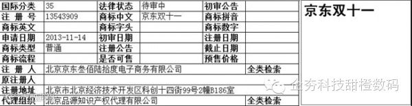 话虽如此,走南闯北的强东哥确实还有过人之处,主商标配合双十一,“京东双十一”,此种组合,十有八九也是能够通过商标审查人员的审查而下证的。