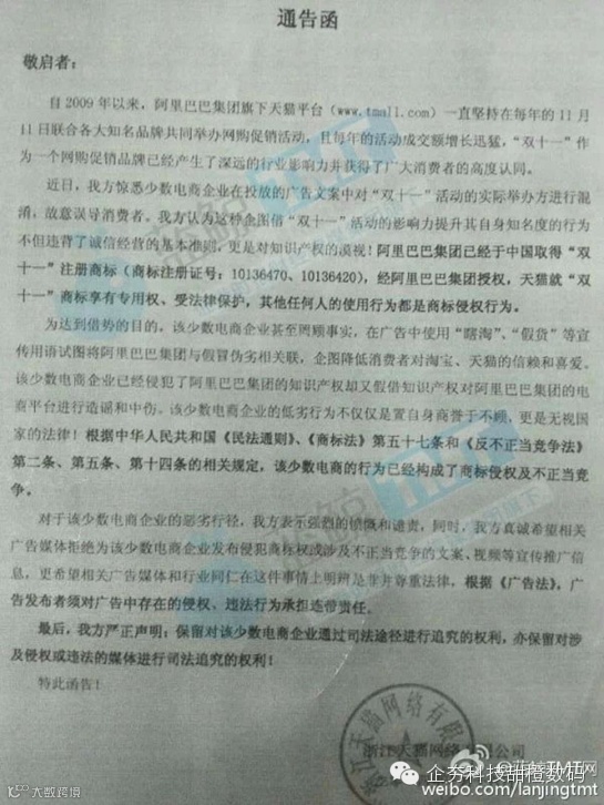 再回到马云哥的天猫的通告函: