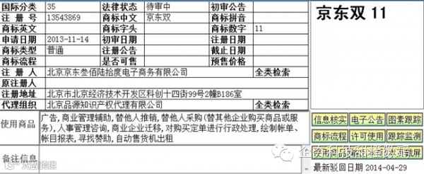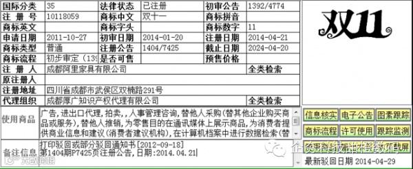 针对双方的理由,笔者进行了一定调查,发现阿里确实获得了2枚双十一商标的注册核准,其中网络销售服务上最重要的1枚信息如下:
