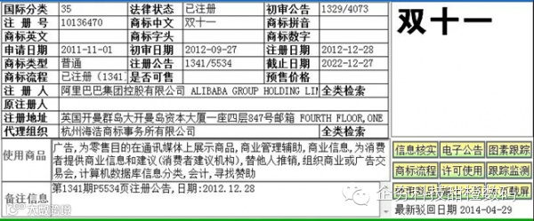 最为关键的问题。请返回前面的商标信息页,再仔细看一眼阿里的商标注册时间:2011年11月1日,商标标识“双十一”。