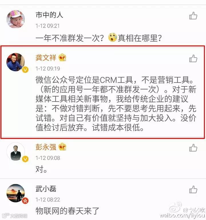 中国电商第一自媒体、电商意见领袖 @龚文祥 老师建议传统企业对待新媒体和新商业工具,应该:不做对错判断,先不要思考先用起来,先试错。对自己有价值就坚持与加大投入。没价值检讨后放弃,试错成本很低。