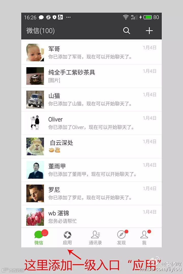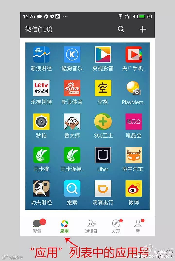 3、应用号不会出现在消息列表中,在微信下方会出现“应用”一级入口,应用列表中会按目前大家已经习惯的展现方式来展示一个个应用,用户可自行调整顺序,但不会因为消息的到来而改变原有的排列方式。