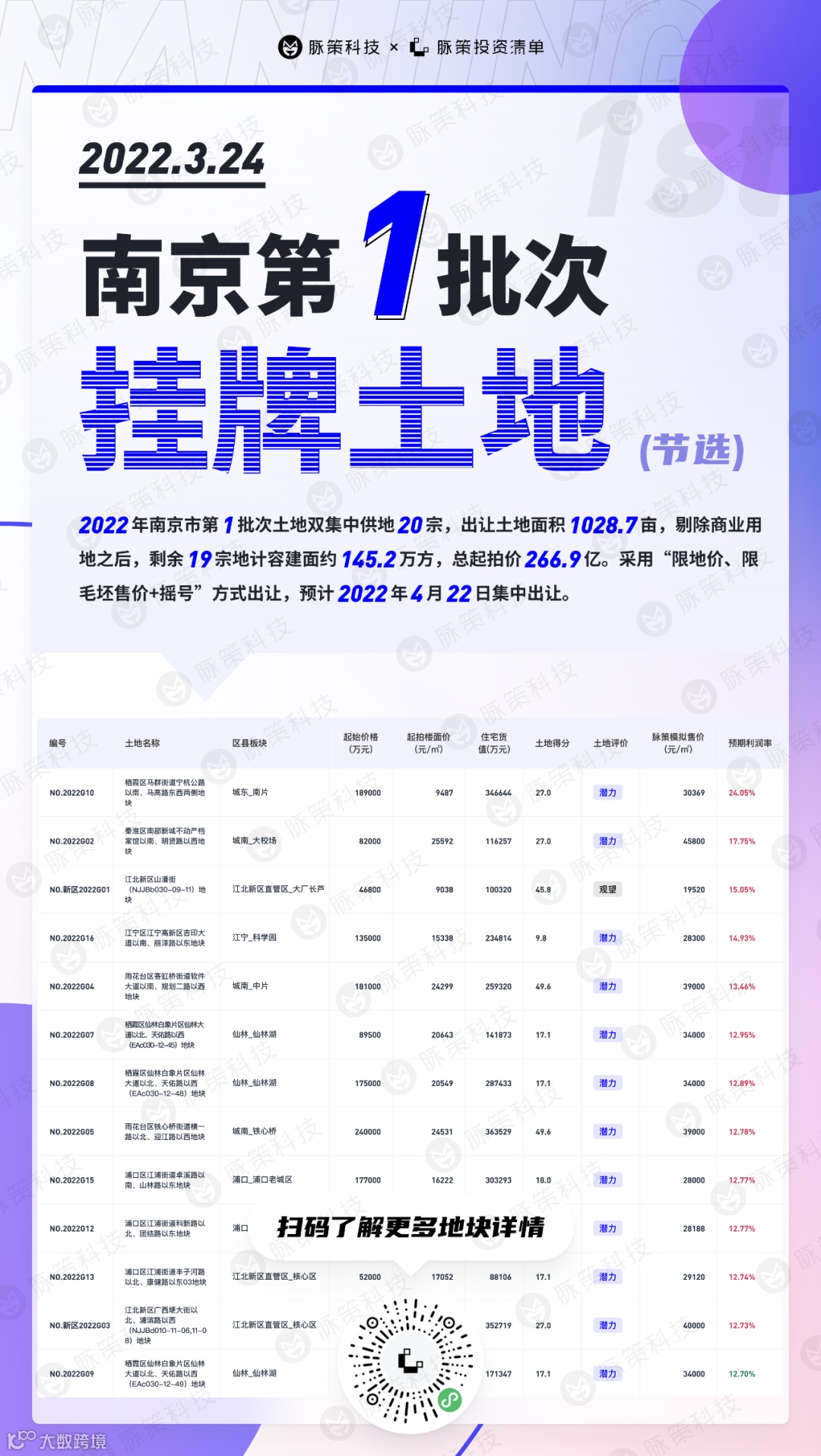 南京和合肥分别在3月24日、2月15日公布了今年第一批集中出让土地,其中南京市20宗、合肥市32宗。脉策整理了部分优质土地与大家分享: