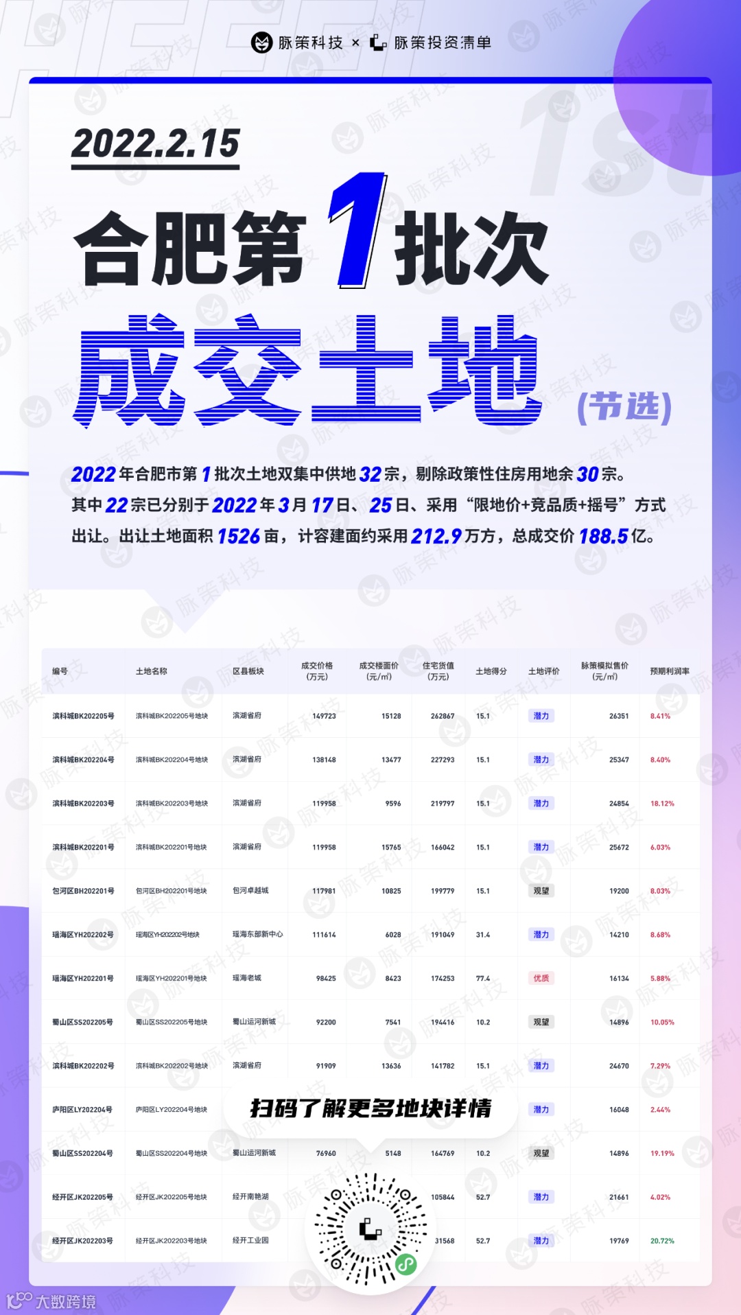 投资清单已上线【重庆】、【杭州】、【宁波】、【南京】、【合肥】等五个城市2021年至2022年土拍和城市科学数据,用户可以免费使用投资清单辅助土地、市场、客户的多重研判,点击卡片即可使用。↓↓↓