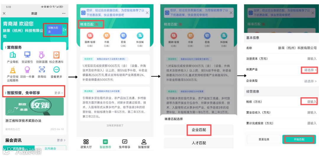 ①点击“智服预督,免申即享”(注意:右上角点击切换,切换查询政策的主体“企业”)→②点击智能推荐板块里面的“精准匹配”按钮→③选择精准匹配的主体“企业”或“人才”→④企业匹配:选择、输入后完善企业信息,点击“开始匹配”获取对应政策。