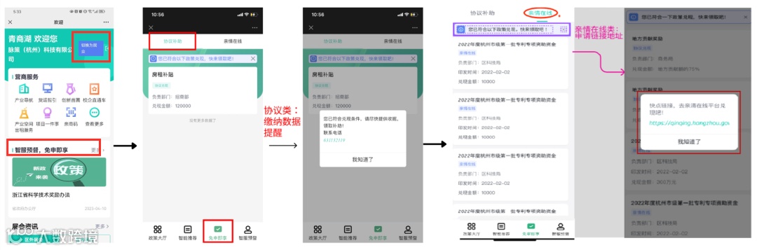 免申即享:通过后台实时抓取企业经营数据、项目信息等,与协议履约条件、亲清在线普惠政策申领条件进行匹配计算,当系统匹配企业满足条件后,可到“免申即享”的板块申领对应的补助。企业负责人/财务人员也会同步收到短信申领通知。