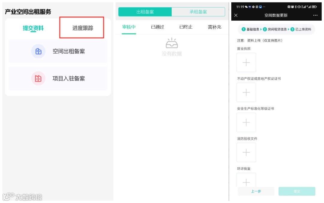 点击进度跟踪,进入系统后,可以对空间基本信息、空间租赁信息及相关文件材料进行补充和更新,实现空间信息在运营端和企业端的维护。