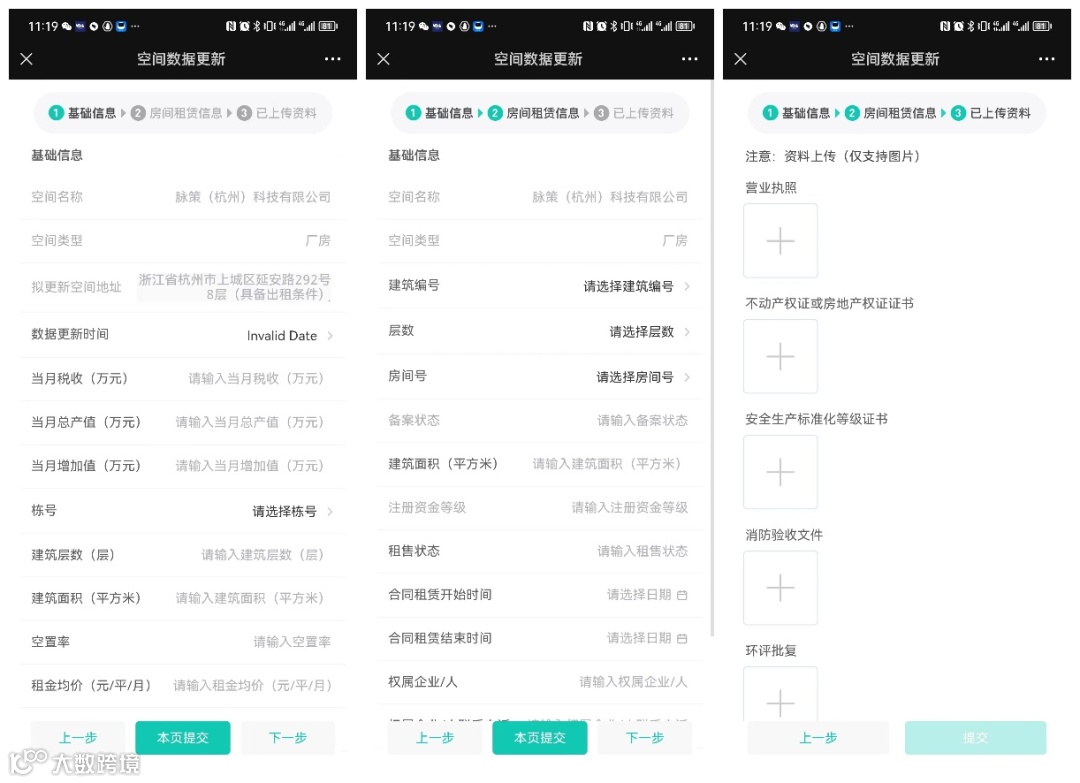 进入系统后,有3个页面对空间的基础信息、租赁信息以及备案文件的内容进行填报和维护。
