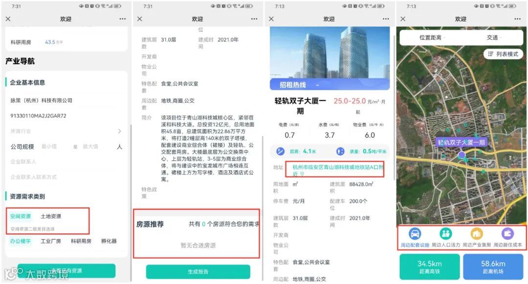 产业导航集成了周边配套地图功能,可以让企业在地图上阅览每个选址的周边交通、商业、科研等配套设施,日间工作人口、夜间居住人口活力情况,周边产业链上下游企业集聚情况等,方便企业选择适合的经营场地。