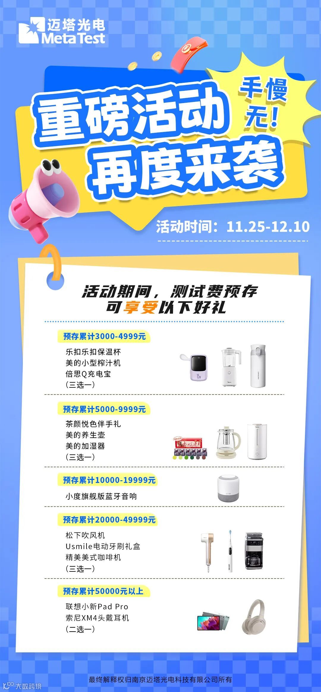 为了给各位客户提供更优质的测试服务,我司提供预存测试费服务,一次预存,一劳永逸,在享受测试费折扣的同时,测试排期有保障,复杂实验响应更及时,还可专享我司不定期推出的定制测试项目。预存费用会进入迈塔光电的专用账户,您可以随时查询金额使用情况。