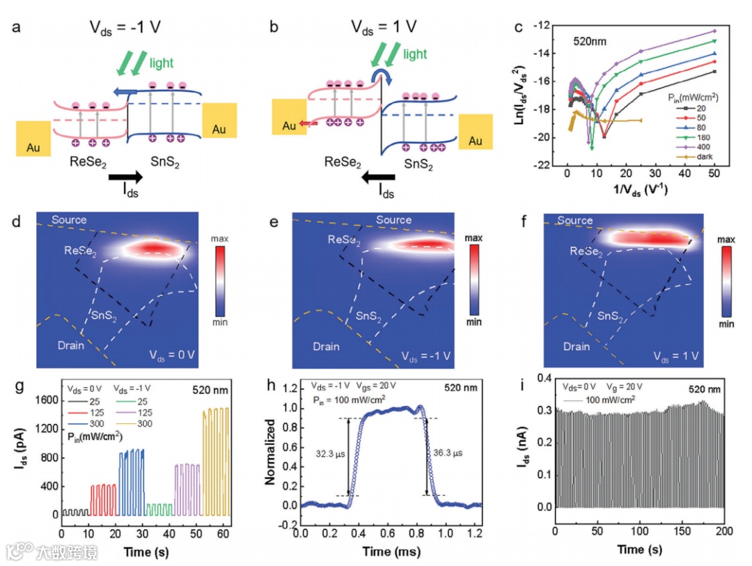 图4. 520 nm波长光照下SnS2/ReSe2异质结构FET的隧穿机制和光响应。a, b) 分别为Vds = -1 V和Vas = 1 V时SnS2/ReSe2异质结构器件的能带图。黑色箭头表示电流方向,水平虚线代表费米能级。c) 正Vds下的福勒-诺德海姆隧穿图,实线是对实验数据的拟合。d-f) 空间分辨的光电流映射图像在d) Vds = 0V,e) Vds = -1V 和 f) Vds = 1V时的情况。白色、黑色和黄色虚线分别指示SnS2、ReSe2和金属电极的区域。g) 在Vds = 0V和-1V,Vgs = 20V条件下的时间依赖性光响应。h) 归一化的光电流响应以及上升/下降时间。i) 在Vds = 0V和Vgs = 20V条件下,SnS2/ReSe2异质结构器件进行了100次循环的光开关曲线。