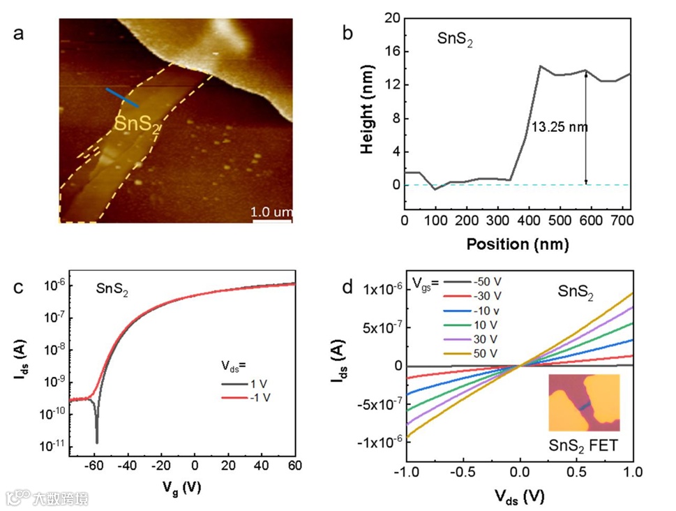 图S5. SnS2-FET的表征和电学性质。a SnS2-FET的原子力显微镜(AFM)图像。b 沿蓝线的SnS2薄片的AFM高度轮廓。c 不同漏源电压(Vds)下少层SnS2-FET的转移特性。d 不同栅极电压(Vgs)下少层SnS2-FET的输出特性。