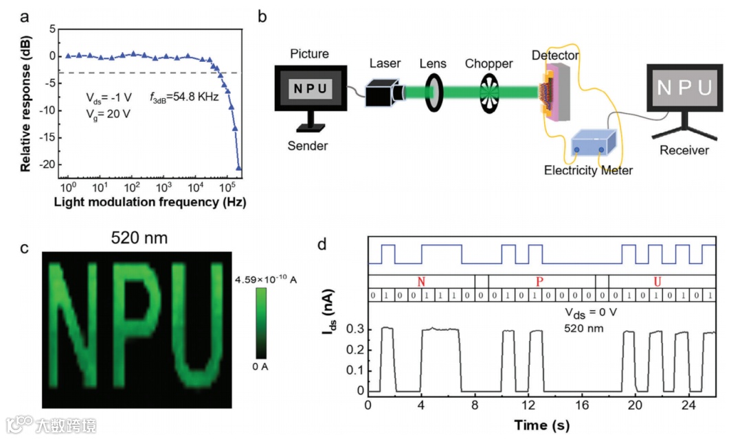 图5. SnS2/ReSe2异质结FET的3dB响应和光检测应用。a) 在520 nm波长光照下,测量SnS2/ReSe2异质结FET相对响应与调制频率的关系。b) 单点图像检测的示意图。c) 通过单点图像检测在520 nm波长光照下获得的“NPU”的电流映射图像。d) 在编码通信系统中用于传输ASCII码“NPU”的输入和输出信号。