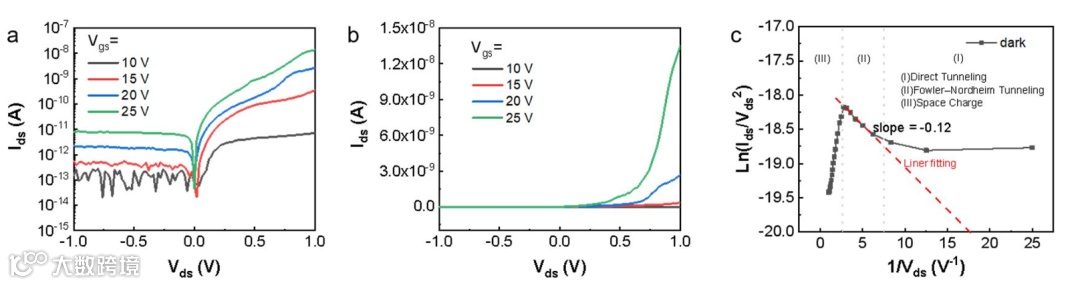 图S4. SnS2/ReSe2异质结FET的电学特性。a 暗场条件下不同栅极电压(Vgs)下的少层SnS2/ReSe2异质结输出特性,采用对数坐标表示。b 暗场条件下不同栅极电压(Vgs)下的少层SnS2/ReSe2异质结输出特性,采用线性坐标表示。c 暗场条件下器件在正向Vds下的Fowler-Nordheim图。实线是实验数据的拟合线。