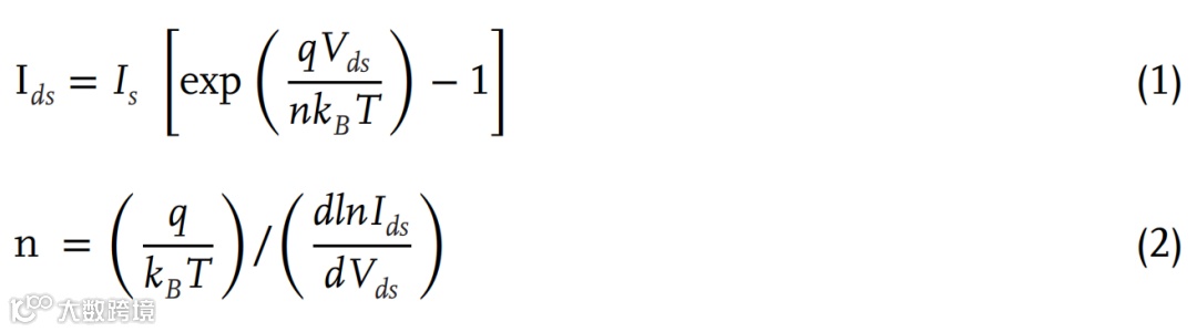 其中,Is、n、q、kB和T分别是反向偏置饱和电流、理想因子、电子电荷、玻尔兹曼常数和温度。方程1表示包含理想因子(n)的二极管输出电流表达式。方程2描述了将方程1转化为理想因子(n)表达式的变化。