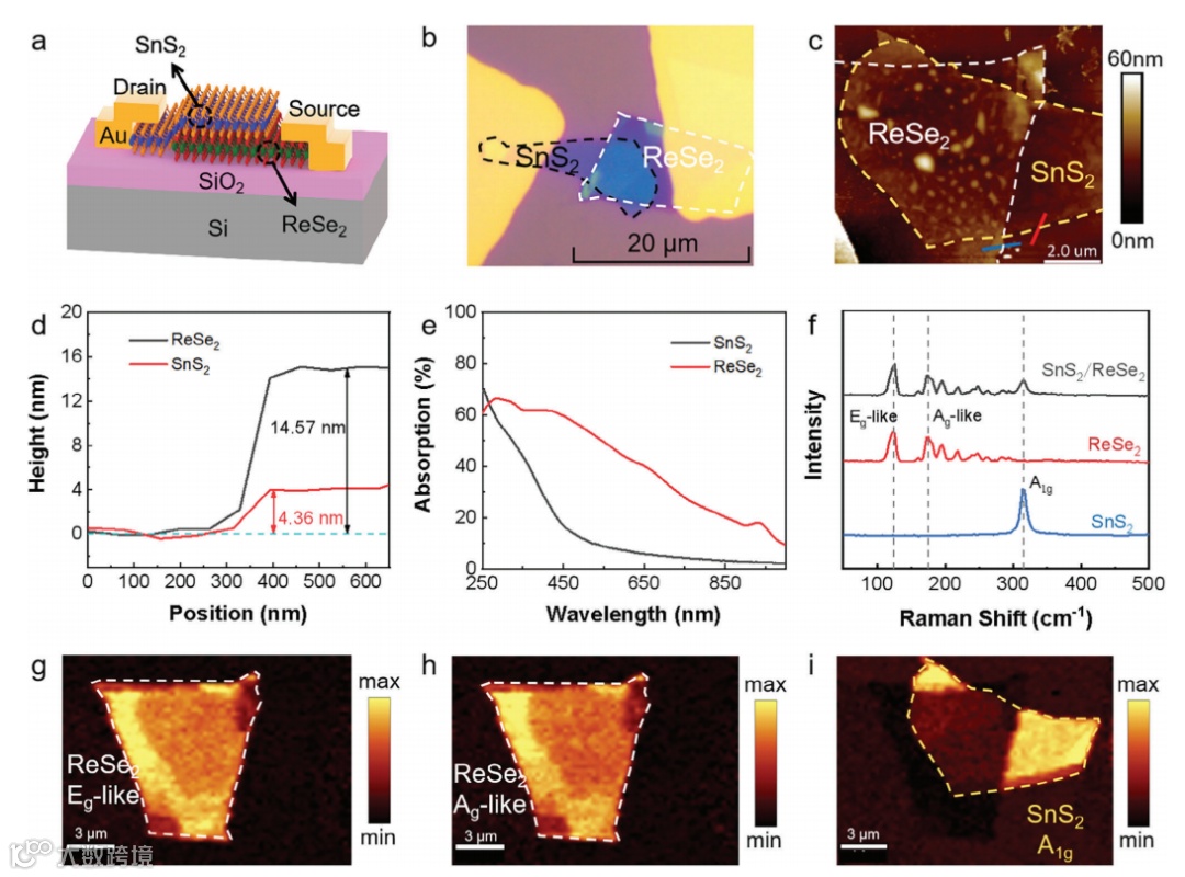 图1. SnS2/ReSe2异质结场效应晶体管(FET)的特征描述。a) SnS2/ReSe2异质结FET的示意图配置。b) SnS2/ReSe2异质结FET的光学显微镜图像。c) SnS2/ReSe2异质结FET的AFM图像。d) 沿红线的SnS2薄片和沿蓝线的ReSe2薄片的AFM高度剖面图。e) SnS2和ReSe2薄片的UV-vis-NIR吸收光谱。f) SnS2、ReSe2及SnS2/ReSe2异质结的拉曼光谱。g) SnS2/ReSe2异质结的类Eg峰的拉曼映射图像。h) SnS2/ReSe2异质结的类Ag峰的拉曼映射图像。i) SnS2/ReSe2异质结的A1g峰的拉曼映射图像。
