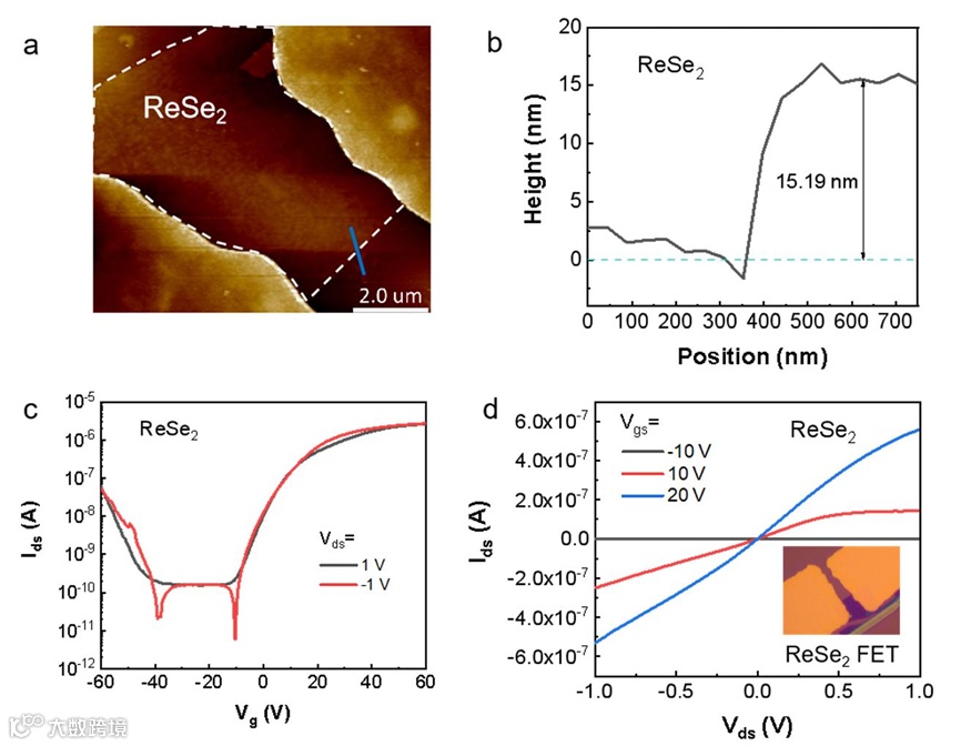 图S6. ReSe2-FET的表征和电学性质。a ReSe2-FET的AFM图像。b 沿蓝线的ReSe2薄片的AFM高度轮廓。c 不同Vds下少层ReSe2-FET的转移特性。d 不同栅极电压下少层ReSe2-FET的输出特性。