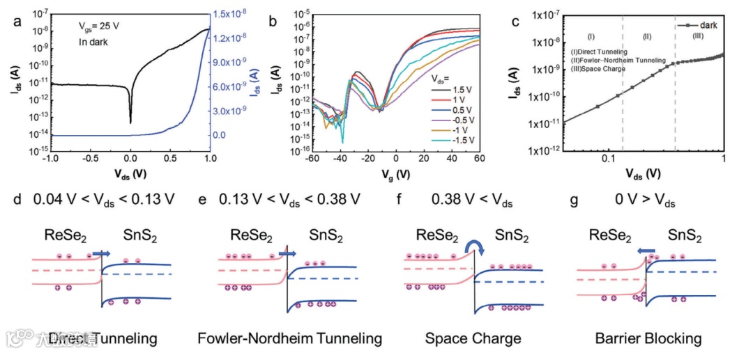 图2. SnS2/ReSe2异质结FET的电学特性。a) 几层SnS2/ReSe2异质结在Vgs 25 V时的二极管特性,左侧和右侧分别对应对数坐标和线性坐标。b) 不同Vds下少层SnS2/ReSe2异质结FET的转移特性。c) SnS2/ReSe2异质结FET的输出曲线,采用对数坐标表示Vds。d-g) 不同偏置条件下的异质结区域能带图:d) 偏置范围在0.04到0.13 V之间;e) 偏置范围在0.13到0.38 V之间;f) 偏置范围超过0.38 V;g) 偏置范围小于0 V。