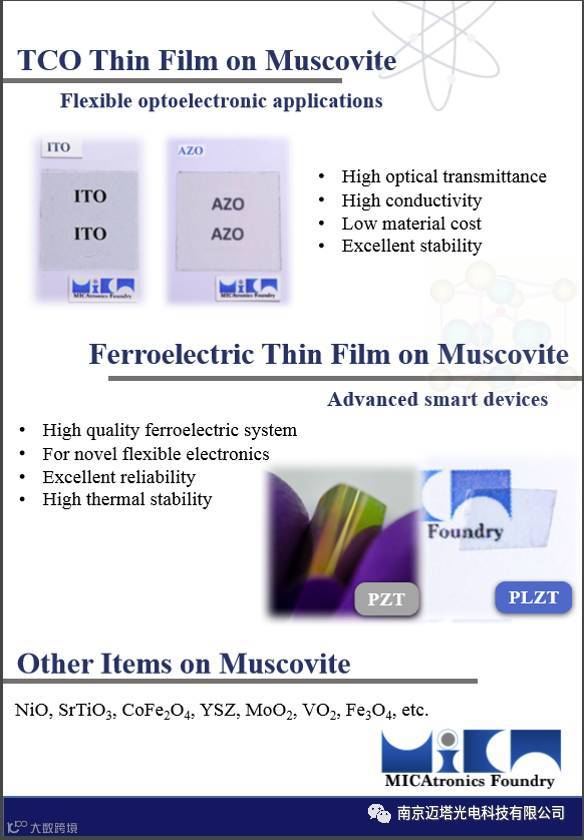 本公司独家代理国际知名机构的基于柔性透明衬底“云母”(mica)的高性能功能薄膜,包括透明导电材料ITO、AZO系列、铁电氧化物PZT、PLZT系列、铁磁材料、半导体氧化物材料等,充分满足各类薄膜定制需求,欢迎来电咨询,联系邮箱ccju@metatest.cn。