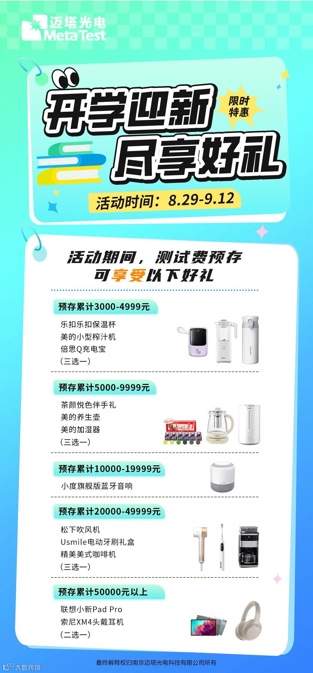 为了给各位客户提供更优质的测试服务,我司提供预存测试费服务,一次预存,一劳永逸,在享受测试费折扣的同时,测试排期有保障,复杂实验响应更及时,还可专享我司不定期推出的定制测试项目。预存费用会进入迈塔光电的专用账户,您可以随时查询金额使用情况。
