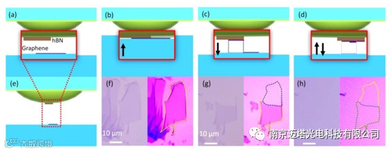 在范德华异质结构中,两种二维晶体之间的旋转角度会对异质结的性能产生重大影响。可以通过改变二维材料堆叠时的旋转角度制备莫尔条纹,进而影响材料电学或者光电性能,该研究领域叫Twistronics。制备二维材料莫尔条纹的前提是,需要知道要转移二维材料的晶带轴。可以通过CVD生长的形貌规则的样品确定晶格取向,进而控制两种材料的旋转角度。另外,因材料的各向异性,在机械剥离样品上会有直的材料边缘(一般为zigzag 或者 armchair晶带轴),再通过Raman光谱的辅助可以确定具体晶带轴。此外,可以通过如图3所示的改进范德华pick-up转移方法精确控制旋转角度。需要在PMMA,PVA,PPC等聚合物上制备一个圆顶结构的PDMS或者环氧树脂(epoxy)来减小与衬底的接触面积。利用该圆顶结构上的h-BN接触到单层石墨烯的一边,使一半的石墨烯贴到h-BN。因h-BN与石墨烯较强的范德华结合力,抬起h-BN之后石墨烯会贴在h-BN下方,之后可以特定角度旋转衬底,再一次进行pick-up就可以实现转角双层石墨烯的制备。