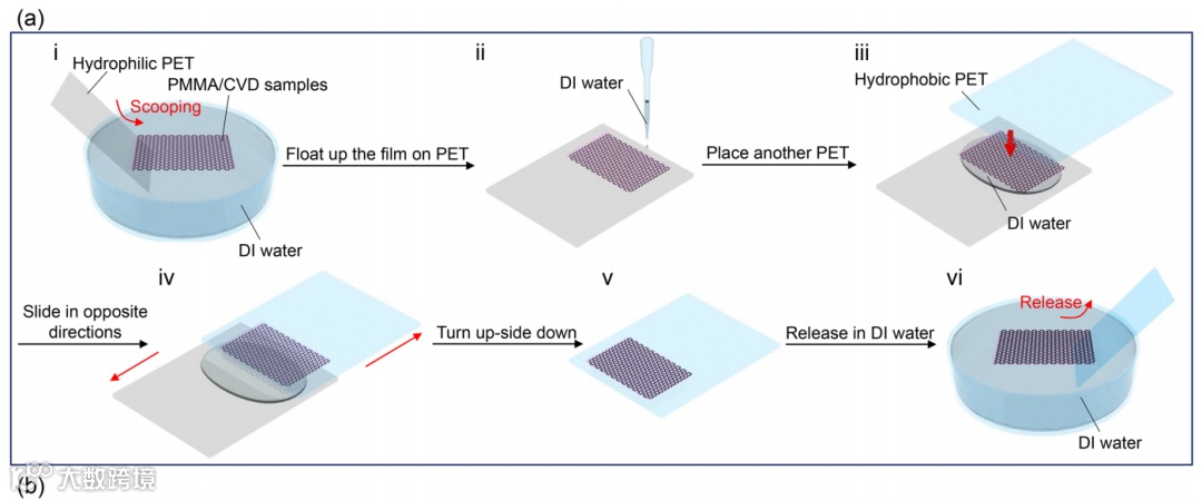 目前多种二维材料可以通过CVD方法制备大面积薄膜,CVD样品的干法转移在二维材料的大规模集成电路制备具有重要的应用前景。以下简述CVD样品的转移步骤:首先在衬底上旋涂一层PMMA薄膜保护CVD样品,之后刻蚀衬底,使样品与PMMA薄膜一起漂浮在刻蚀液中。冲洗刻蚀液过后利用PVA /硅基板从溶液中取出PMMA/CVD样品,在丙酮中浸泡去除PMMA。将PDMS贴在CVD样品/ PVA /硅的上方,浸泡在去离子水中溶解PVA使样品与硅衬底分离,这样可以在PDMS上方得到CVD样品。随后的转移步骤与PDMS干法转移方法相同。另外,可以通过借助亲水/疏水PET实现二维材料的翻转,实验步骤如图1a所示。首先利用疏水性PET将CVD样品/PMMA捞出,并在PMMA旁边滴加去离子水使其漂浮在水滴上方。利用氧等离子修饰过的亲水性PET薄膜慢慢接触水滴,因PMMA为亲水性,会贴在亲水性的PET上方,水平分离两个PET,可得到PET/PMMA/CVD材料,实现二维材料的翻转。之后可以通过上一期所述的PMMA干法转移方法实现转移。