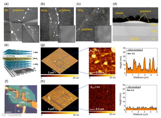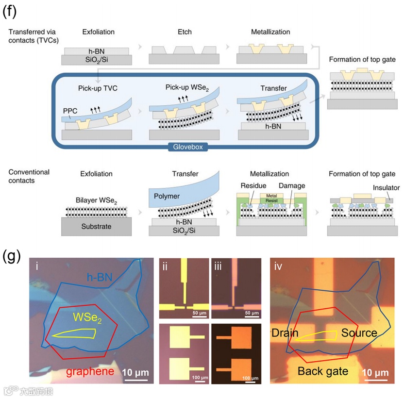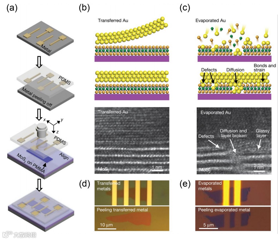 目前制备二维材料器件时,绝大部分器件是通过热蒸镀或者电子束蒸镀的方法将金属沉积在刻有图案的二维材料上方。但是因蒸镀过程中较高能量的金属原子,不可避免的在接触区域引入缺陷降低器件性能,难以实现理想的金属半导体肖特基接触。可以通过如图4所示的电极转移方法(电极预先沉积在衬底上,再通过物理转移到二维材料上方)得到干净理想的二维材料/金属界面。与电极蒸镀方法不同,金属电极转移方法可以实现原子级平整,无缺陷的理想界面。并且通过转移Au, Ag, Pt, Pd, Cu等具有不同公函金属实现金属电极公函与二维材料的导带/价带能级的匹配,以制备理想的欧姆接触或者调控材料的电子/空穴导电模式。