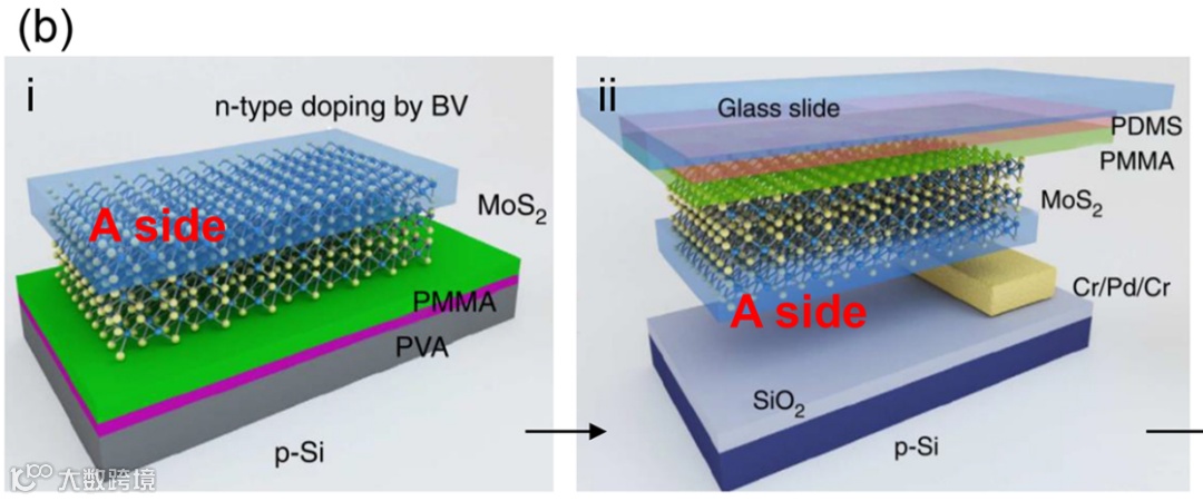 图1 (a) CVD样品转移过程中的二维材料翻转。(b)对二维材料进行化学掺杂。