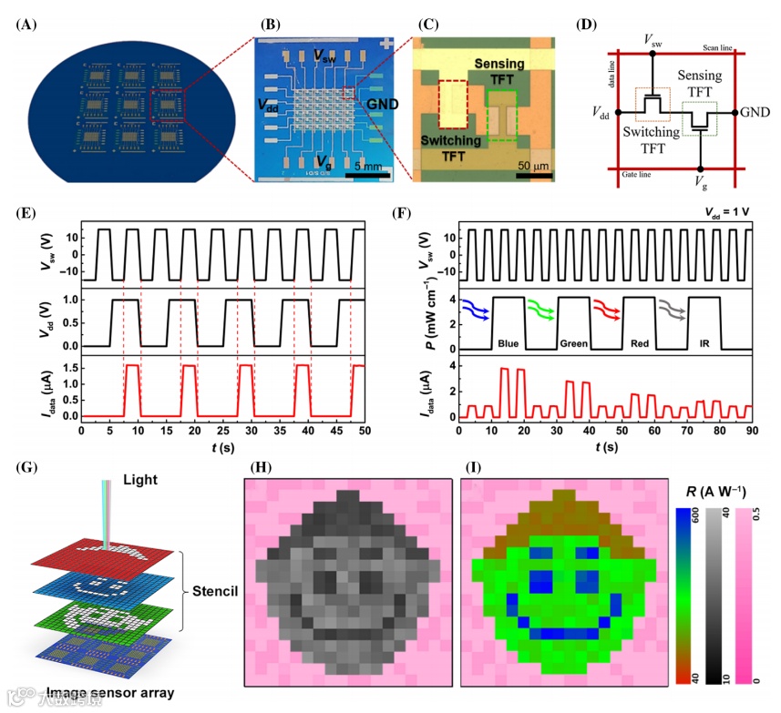 图6 双视觉图像传感阵列。(A) 4 英寸晶圆上九组基于 WS2 的6 × 6 有源像素图像传感器阵列。(B) 来自 (A) 的 6 × 6 图像传感器阵列的放大图。(C) 由不透明顶栅开关和透明顶栅传感晶体管组成的单像素的光学显微图像。(D) 图像传感器的单像素电路图。(E) 不同电压脉冲(V sw和V dd)下图像传感器像素的电开关特性。(F)在固定V g = 15 V 和 V dd = 1 V 的情况下, WS2光电晶体管在电压(V sw)和 RGB-NIR 光脉冲(P inc = 4.2 mW cm −2)下的光诱导开关特性 。(G) 使用 4 英寸晶圆上的九组图像传感器阵列(6 × 6)通过光模板投影进行图像捕获的示意图。(H、I) 4 英寸晶圆上的 324 个有源像素的 NIR 和 RGB 光的光响应度映射,分别显示了 NIR 和 RGB 光形成的百搭图像。